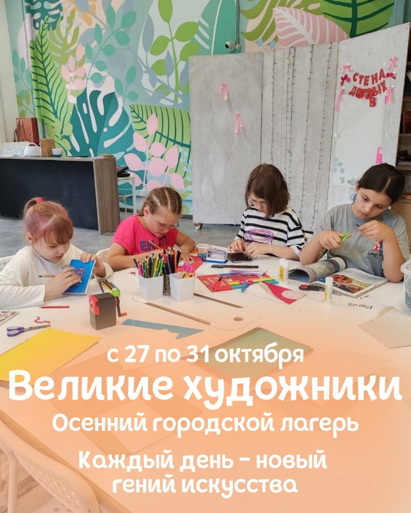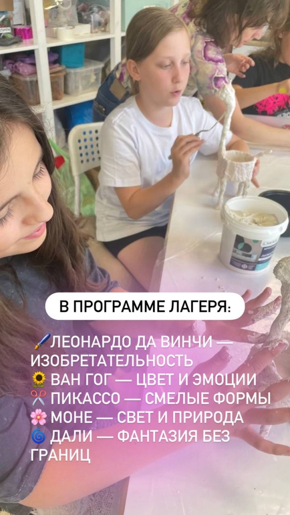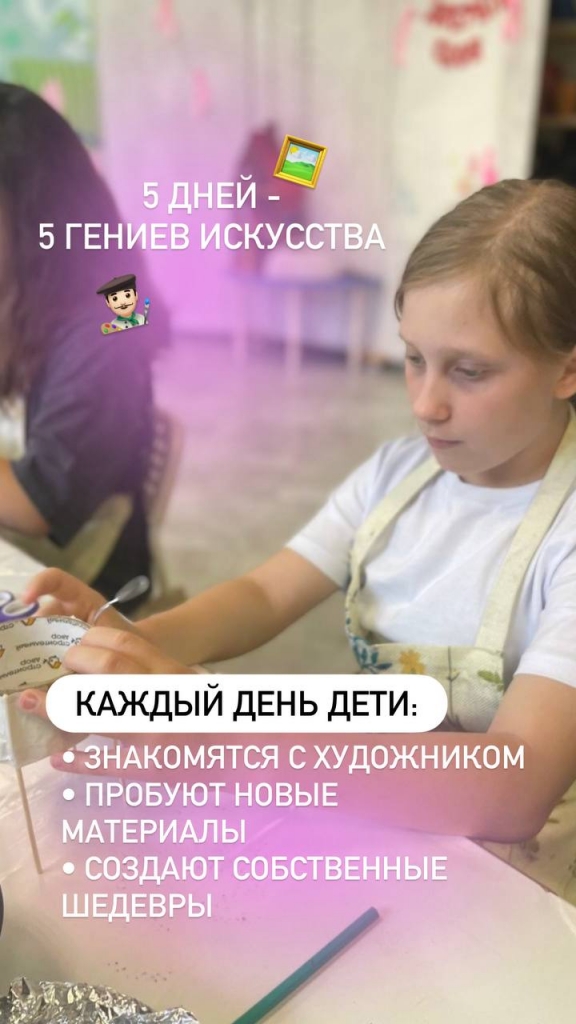 Каждый день ребята будут знакомиться с творчеством великих мастеров и пробовать разные материалы и техники: графику, акварель, гуашь, пастель, пластилин, коллаж, шерсть.