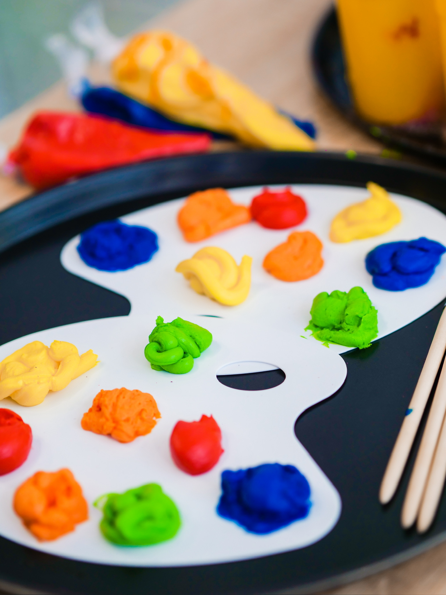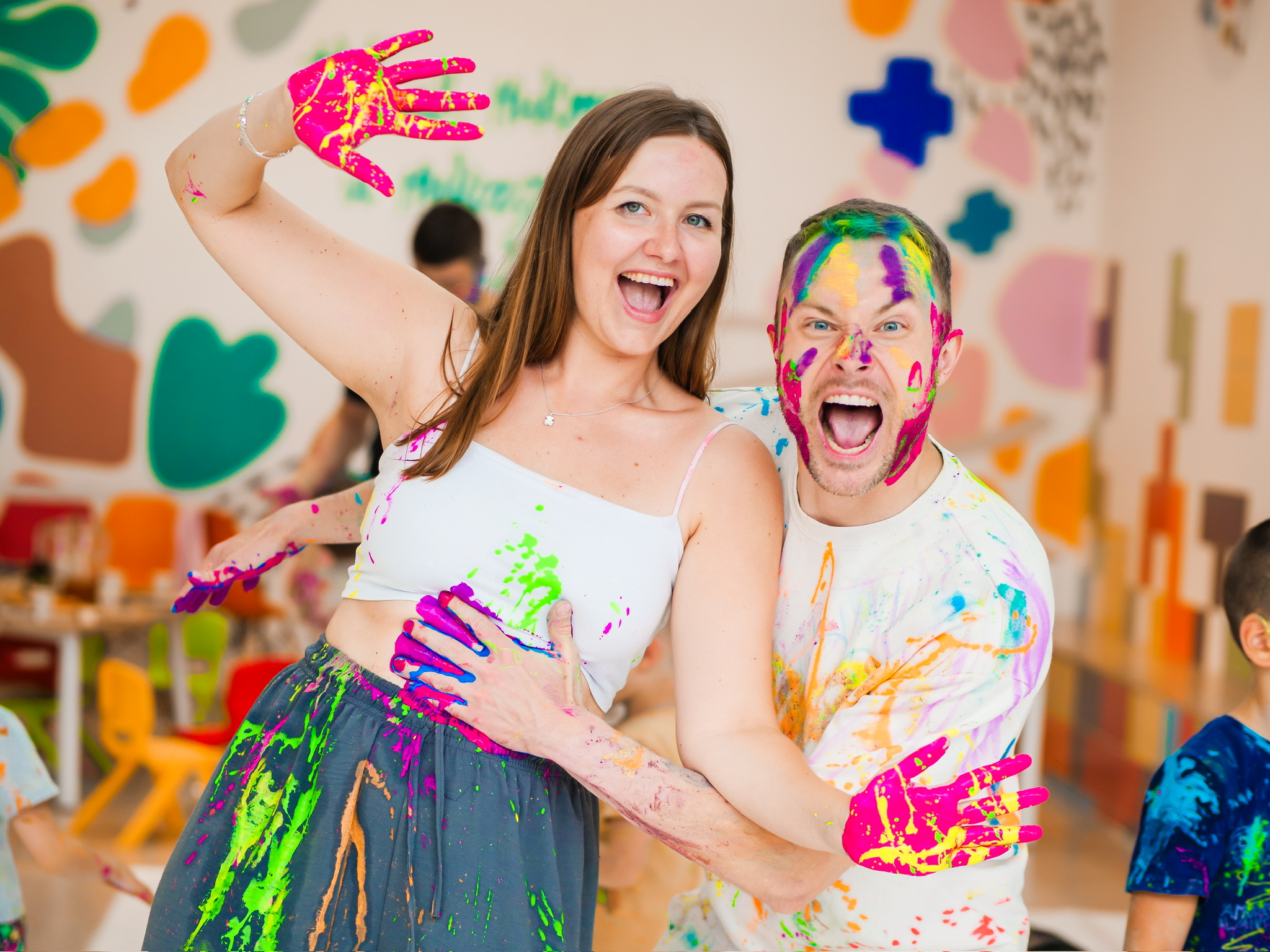 В лучших традициях Kids Point! Наш ведущий погружает участников в мир творчества, в яркую игру, используя разнообразные художественные материалы — от мелков до больших кистей и валиков!