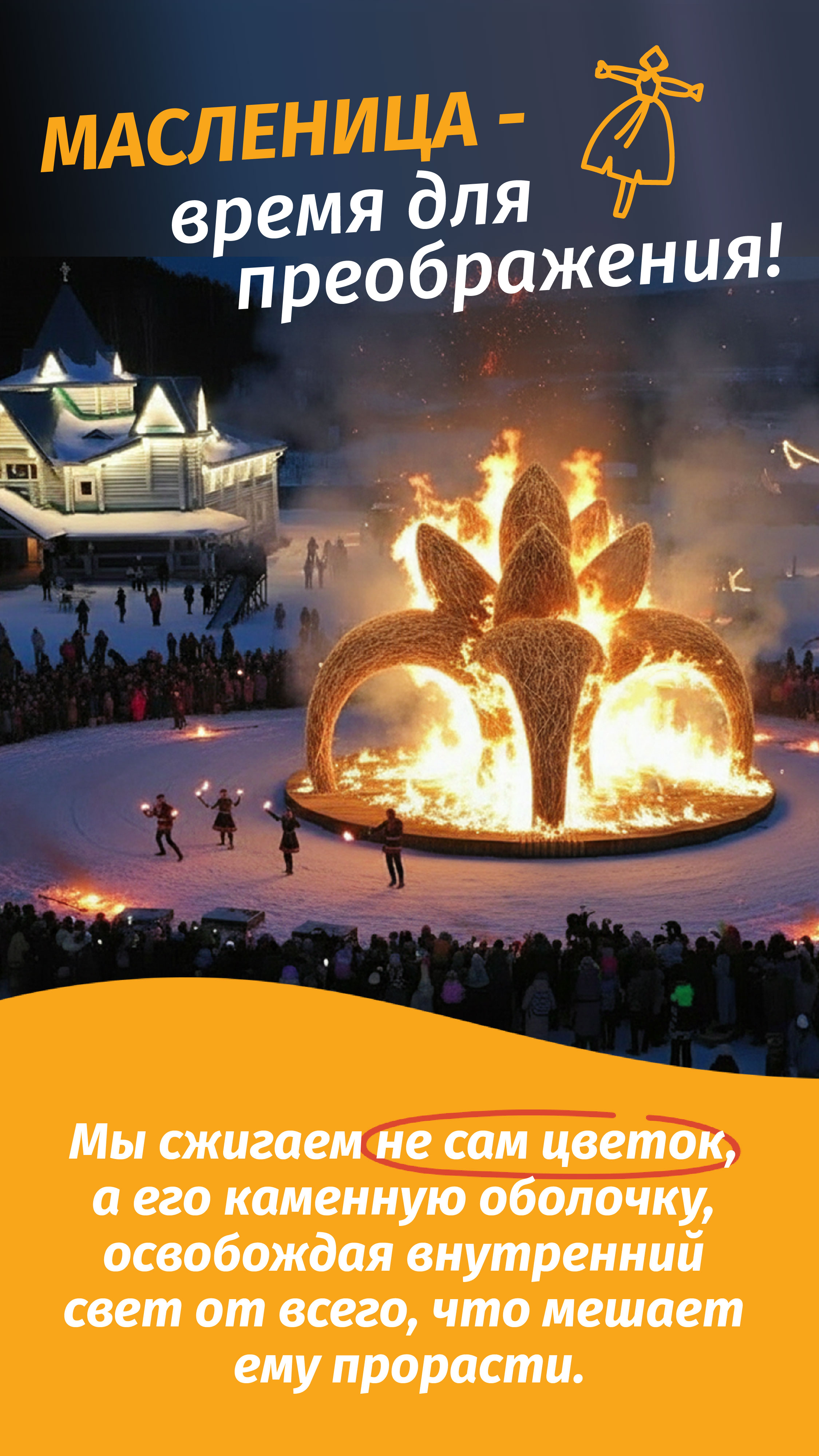 Поэтому наш праздник — это история о волшебном преображении. Когда мы все вместе подходим к цветку, мы будем сжигать не саму красоту, а лишь его «каменную» скорлупу, тяжёлую зимнюю оболочку. Мы поможем внутреннему свету наконец вырваться наружу и превратиться в весеннее солнце! Это и есть главное чудо Масленицы — общее, радостное освобождение.