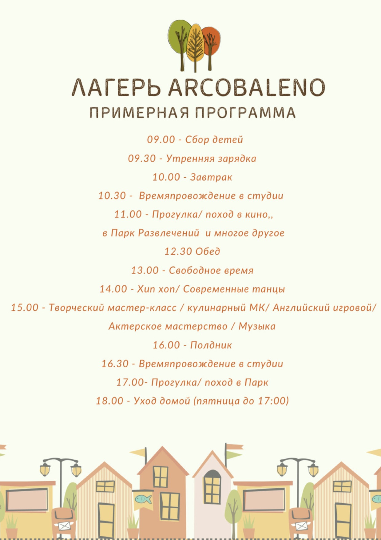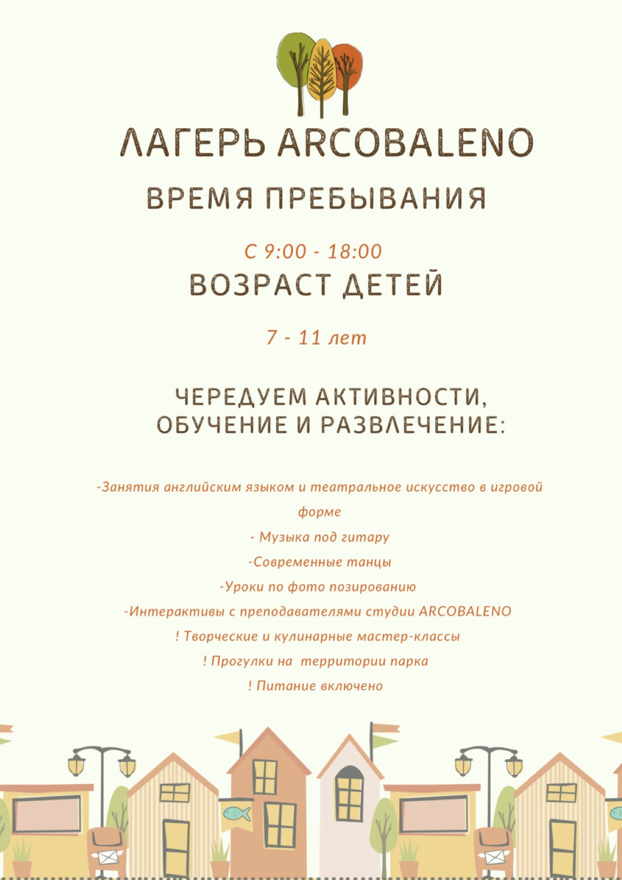 В лагере работают педагоги студии развития ARCOBALENO и выпускники “школы вожатых”. Поэтому здесь ребенку будет безопасно, полезно и очень интересно. Это подтверждено многочисленными отзывами ребят, которые побывали в лагере.