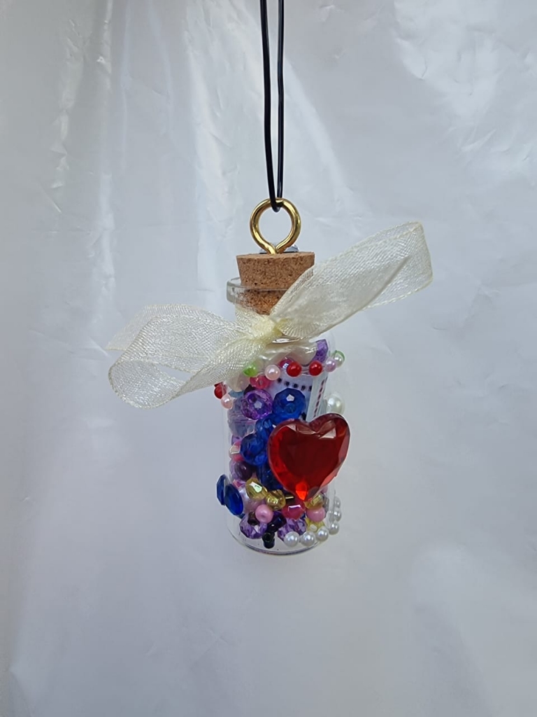 В бутылочку засыпаются бусинки и сверток с пожеланием, фиксируется пробкой, в пробку ввинчивается крючок, через который продевается шнурок.