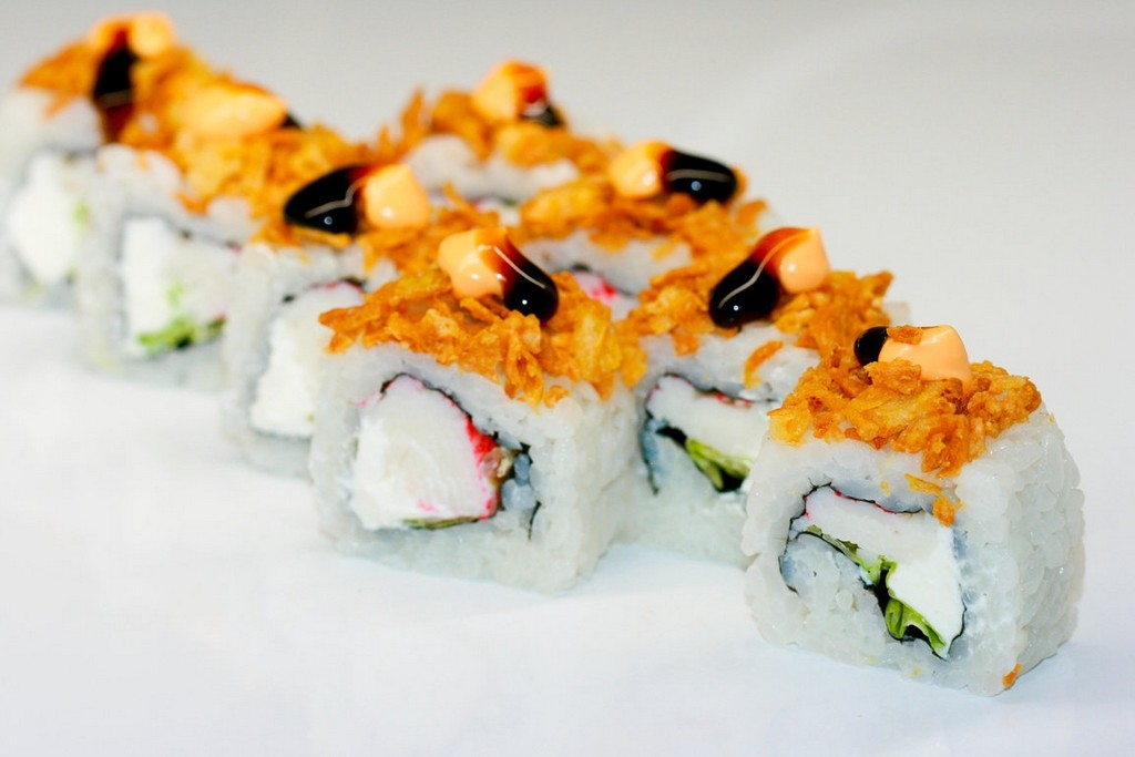 Нори, рис, сливочный сыр, краб сурими, лист салата, соус "Сырный", соус "Терияки", лук жареный.  200 гр