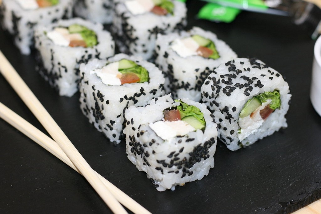Нори, рис, сыр Фета, курочка копчёная, огурец, томат, лист салата, кунжут чёрный.  215 гр