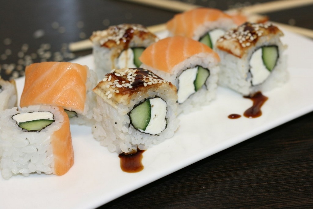 Нори, рис, сливочный сыр, лосось, угорь копчёный, огурец.  190 гр