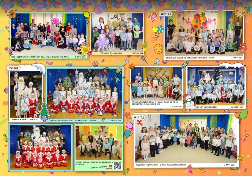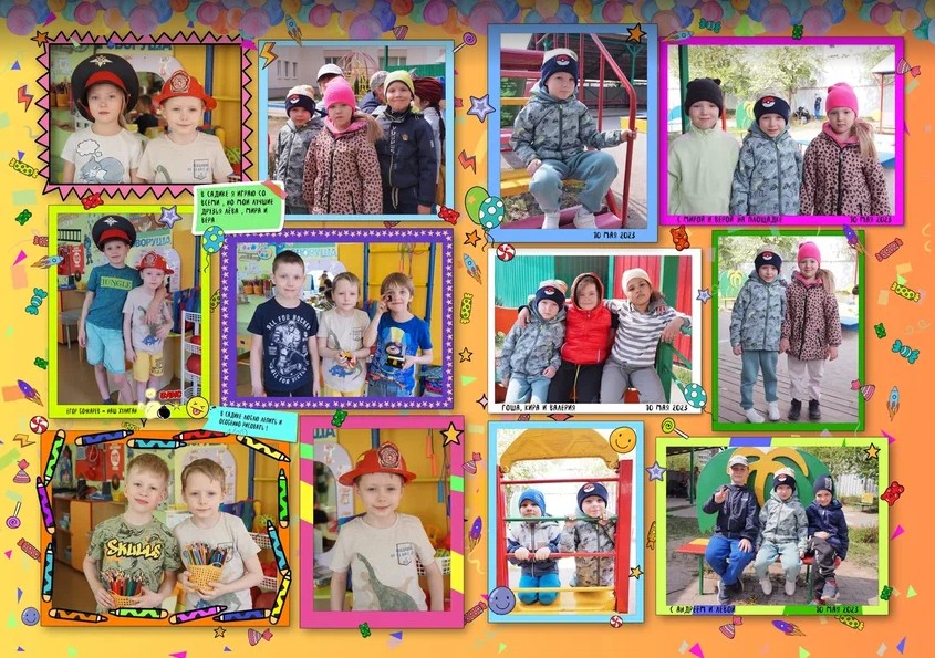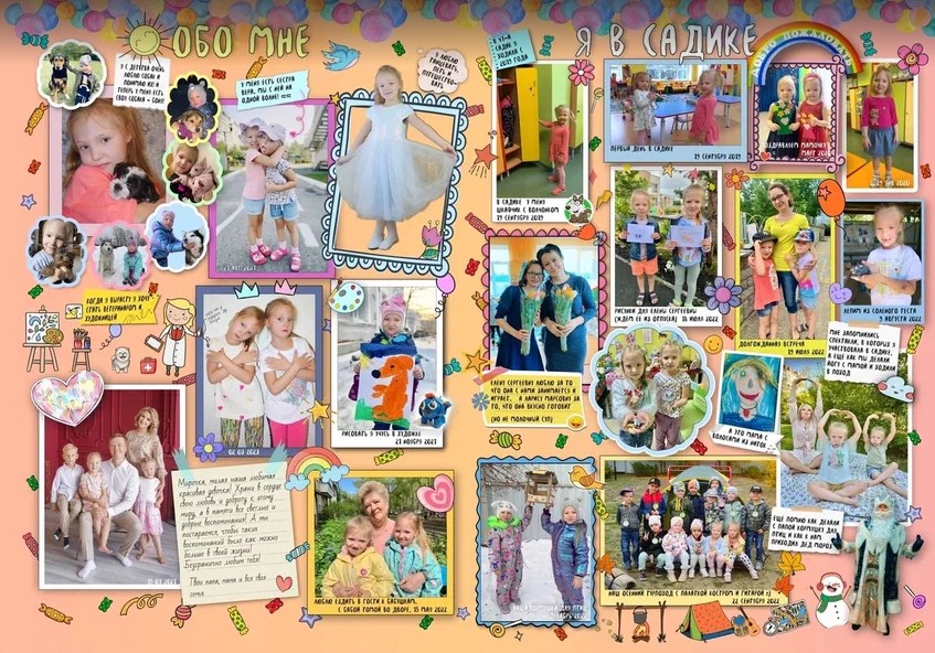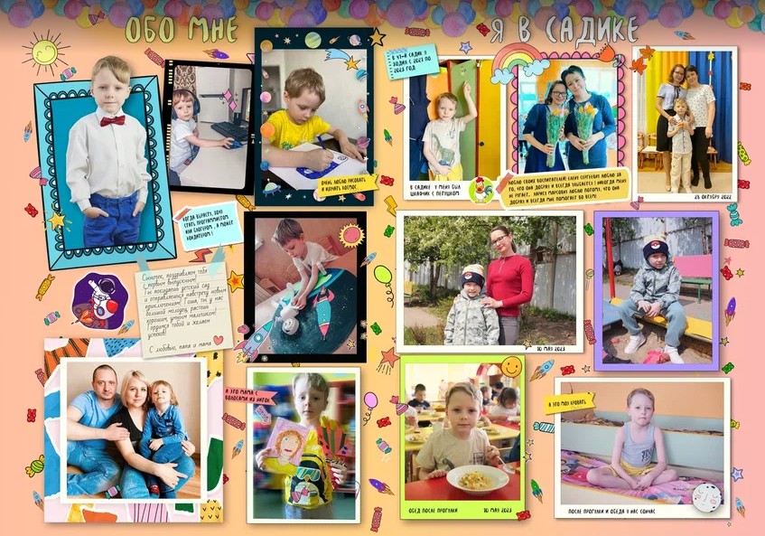 В альбоме используются фотографии с фотосессий, которые я могу провести в садике, а так же фотографии из личного фотоархива заказчиков. Мини-интервью с ребенком могут провести его родители.
