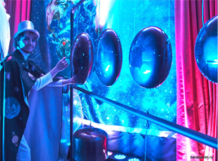 Дети попадают в своеобразный «Музыкальный планетарий» – пространство, где звучит музыка небес, унося всех в мир фантазий и мечтаний. Ребята сами создадут эту музыку и под звуки «космических» барабанов ILdrum, Hang, тибетских чаш, китайских колокольцев искупают именинника в «Звуковом водопаде» и загадают свои заветные желания.